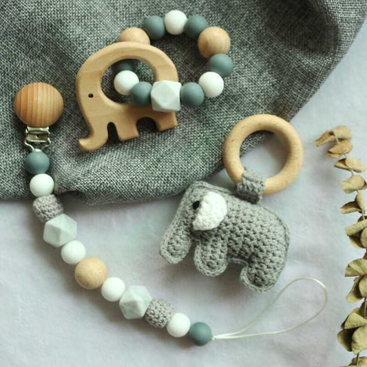 Pacifier Clip Crochet Elephant Rattle Toy Set - Grey