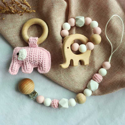 Pacifier Clip Crochet Elephant Rattle Toy Set - Pink